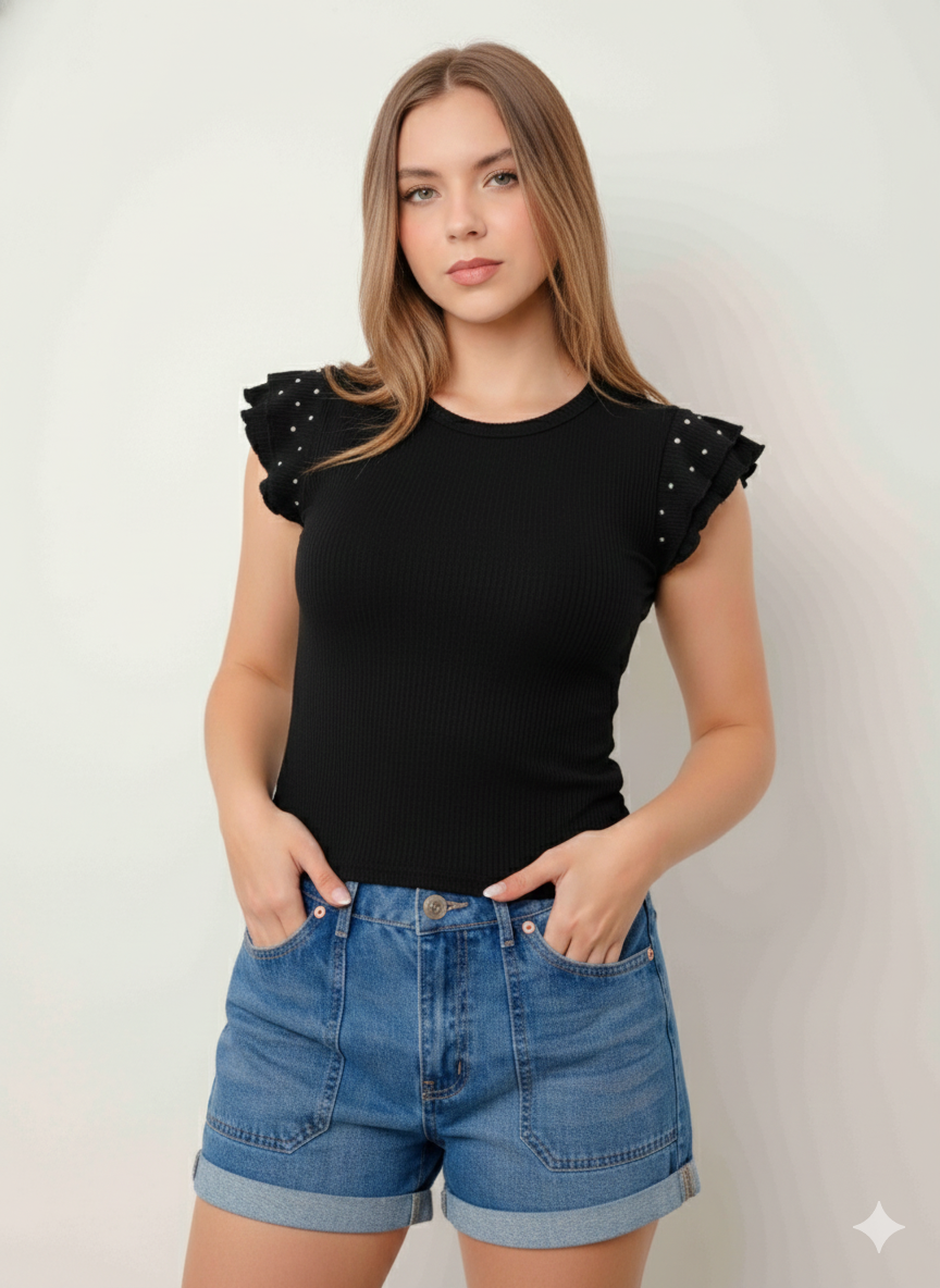 Polo Rib ยซButterfly SleevesยปยกDale un toque dulce a tu dรญa! ๐ Este polo de textura acanalada destaca por sus hermosas mangas con volantes en capas, que aportan movimiento y un aire romรกntico a cualquier look. โจ Es la prenda perfecta que combina la comodidad de un bรกsico con la elegancia de una blusa. ๐