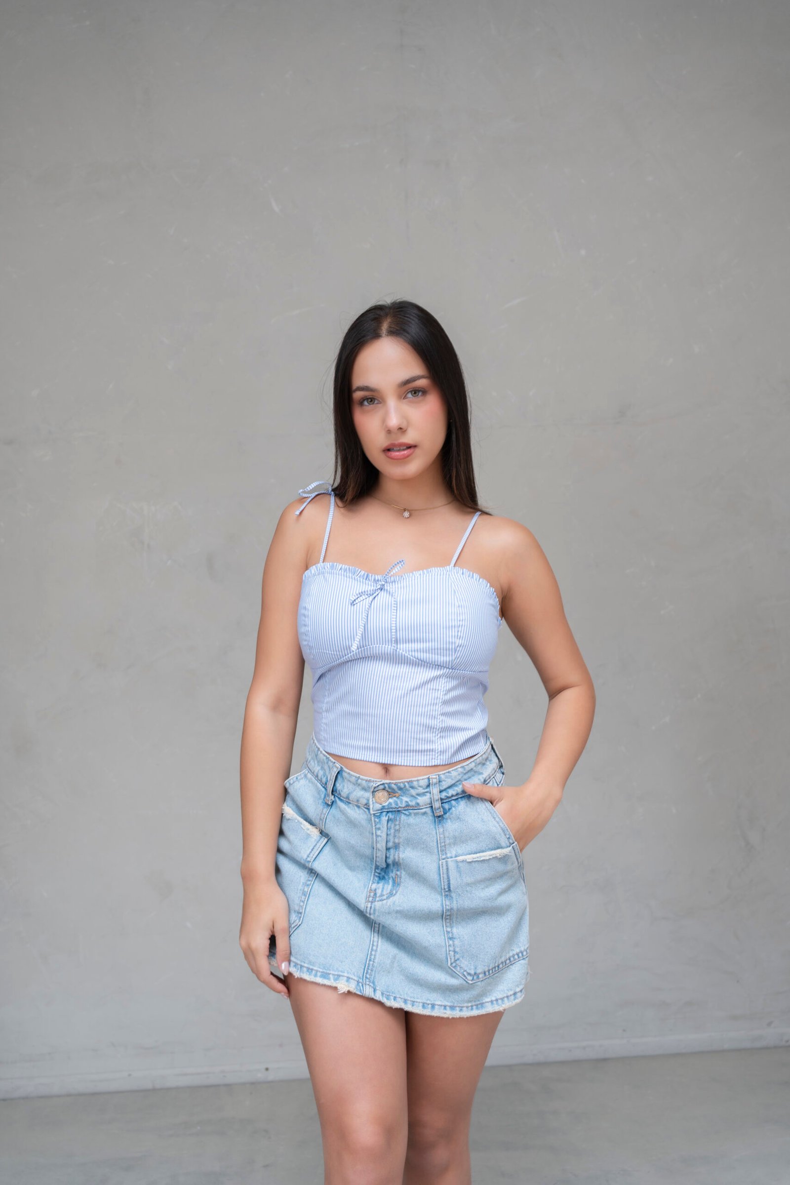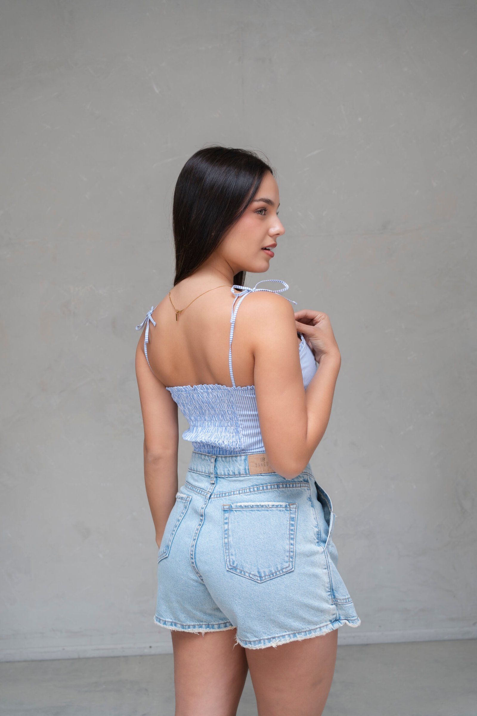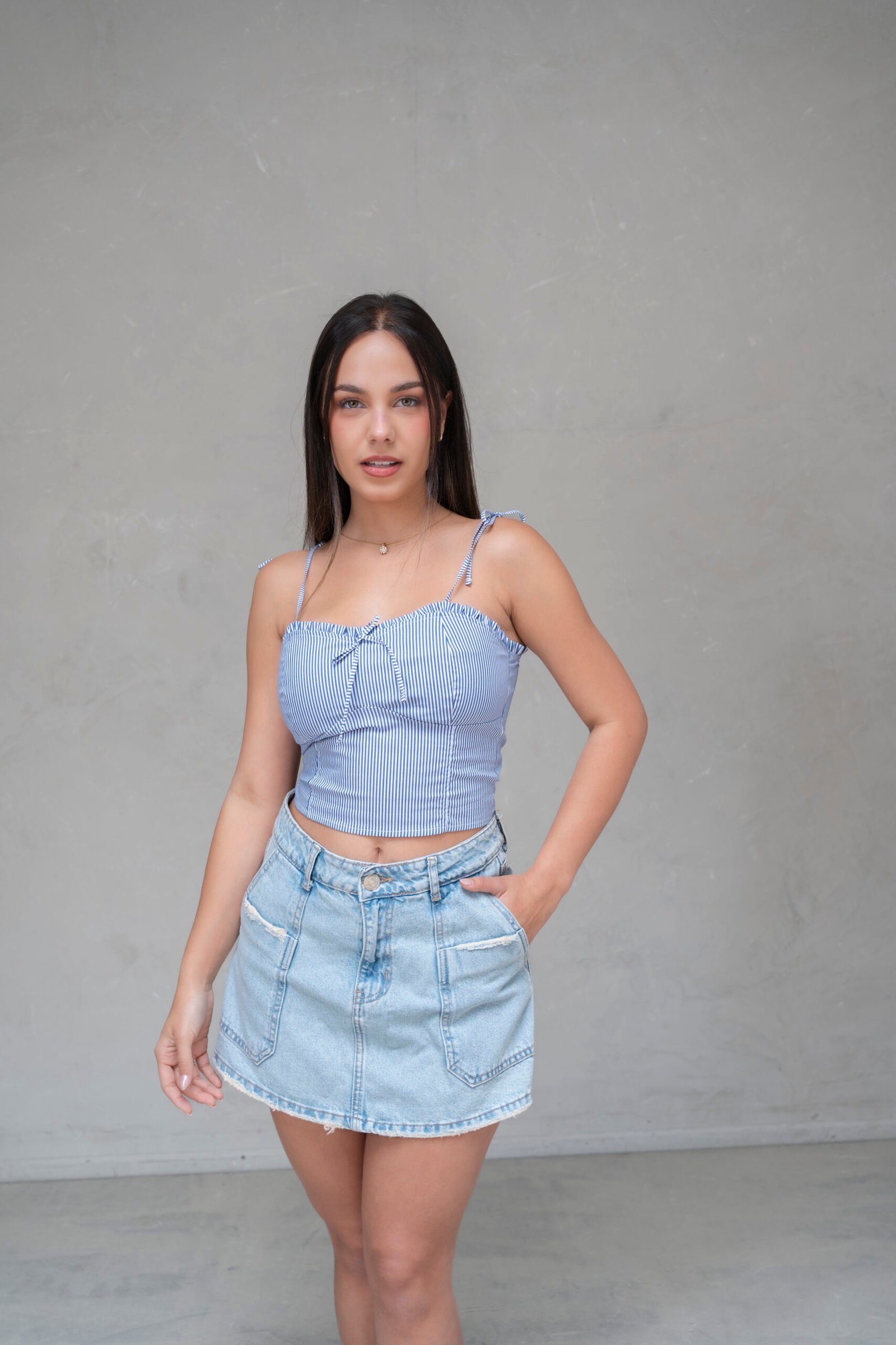 Top bustier en popelina listado, ligero y fresco que se adapta al cuerpo. Diseño con tirantes ajustables, moño frontal y espalda elástica que realza la silueta. Fit: Ajustado (elástico)Material: PopelinaModelo: Usa talla S – Estatura 1.68
