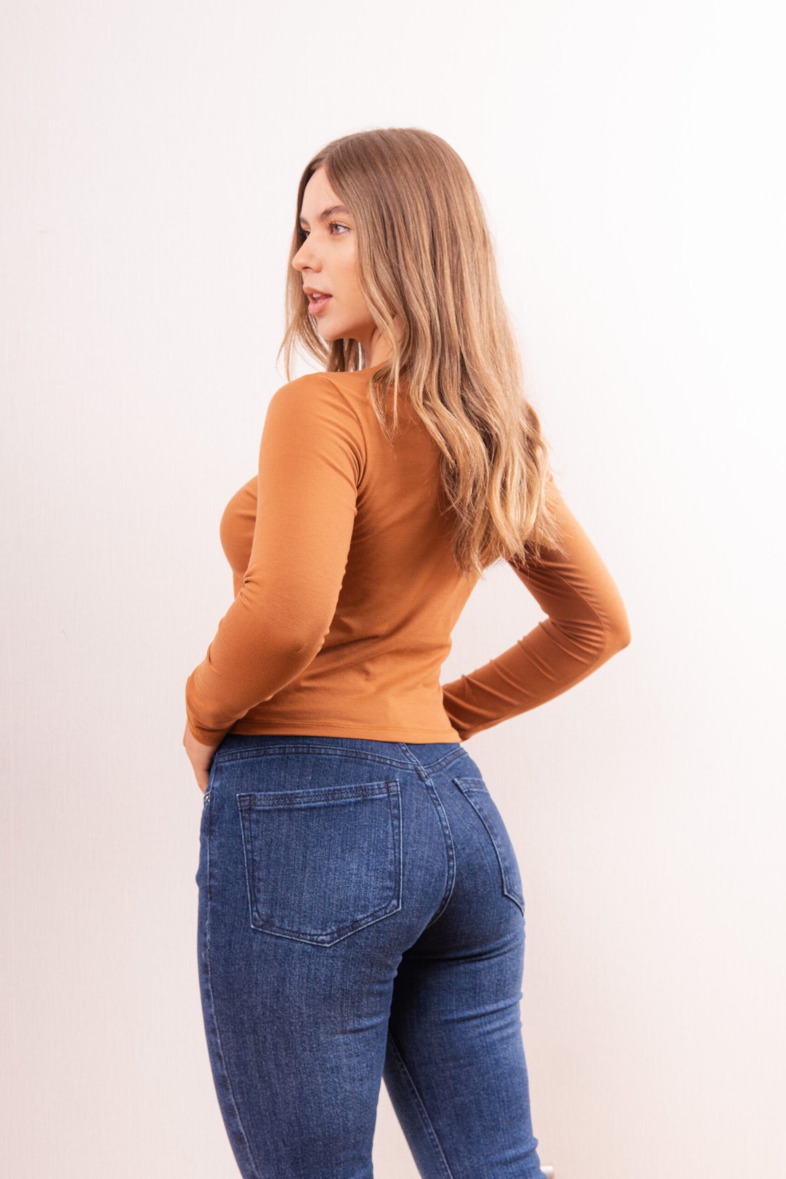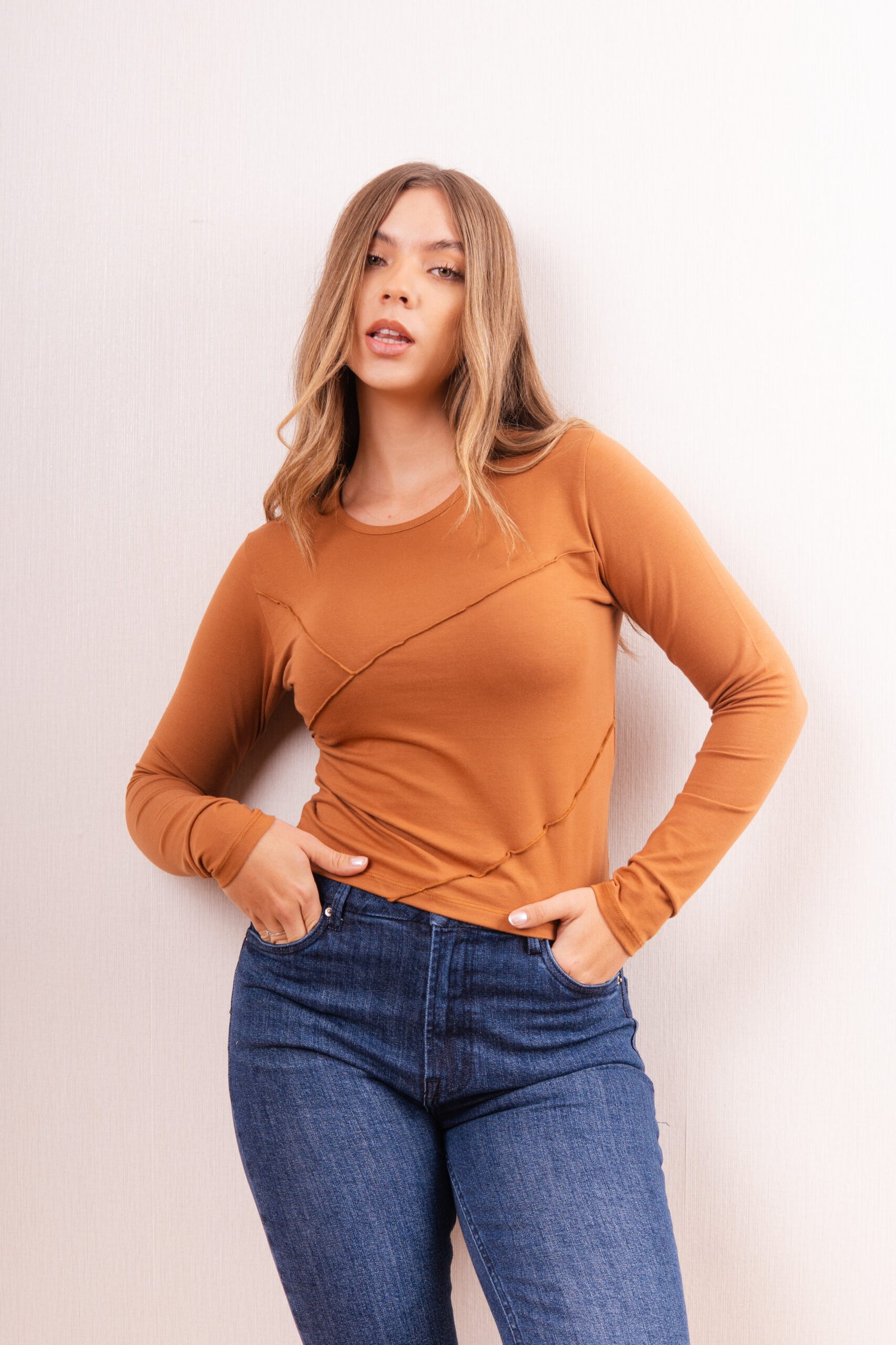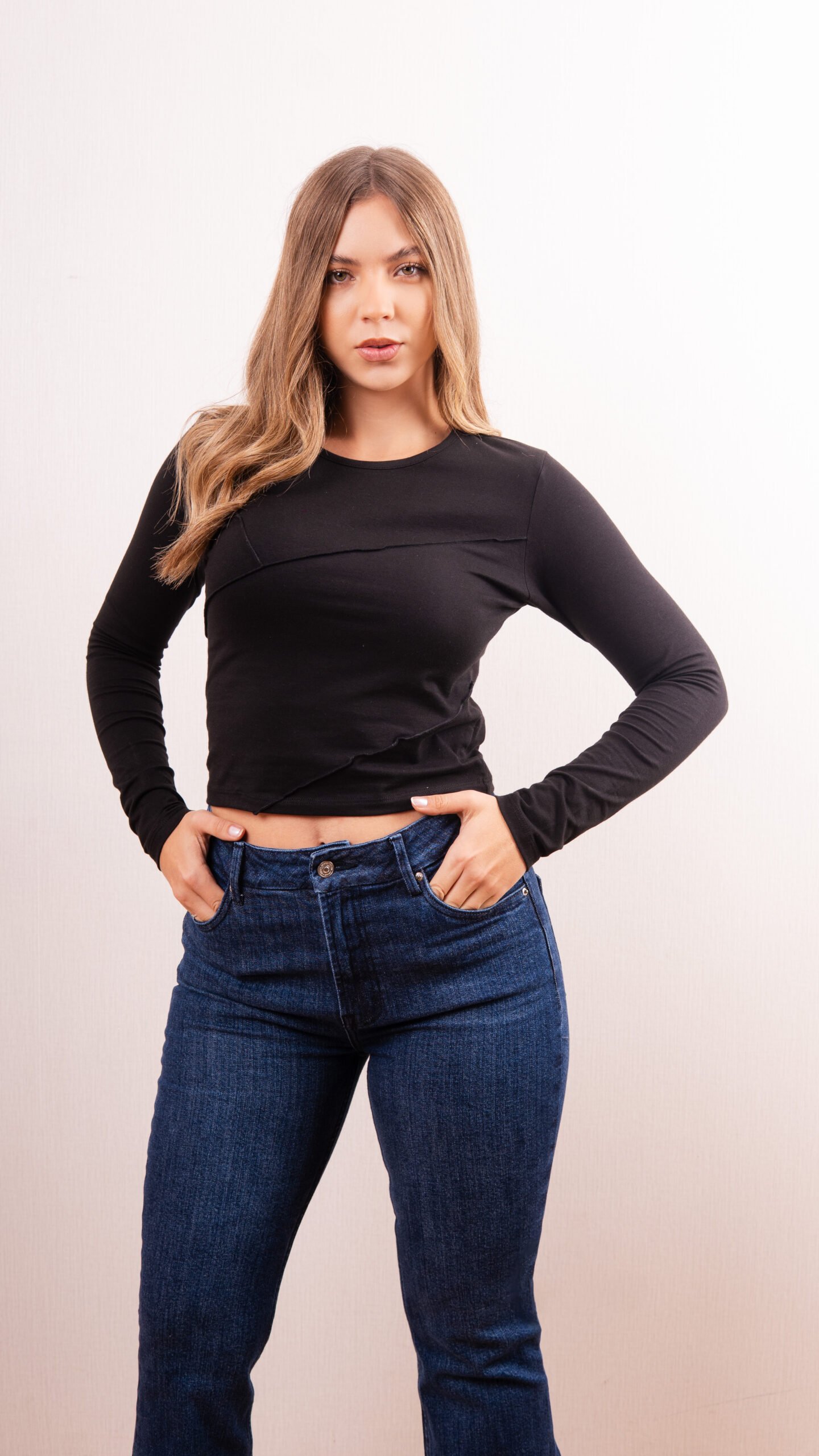 Polo de algodón licrado, suave y elástico que se adapta al cuerpo. Diseño de manga larga con costuras asimétricas que estilizan la silueta, ideal para un look moderno. Fit: Ajustado (stretch)Material: Algodón licradoModelo: Usa talla S – Estatura 1.66