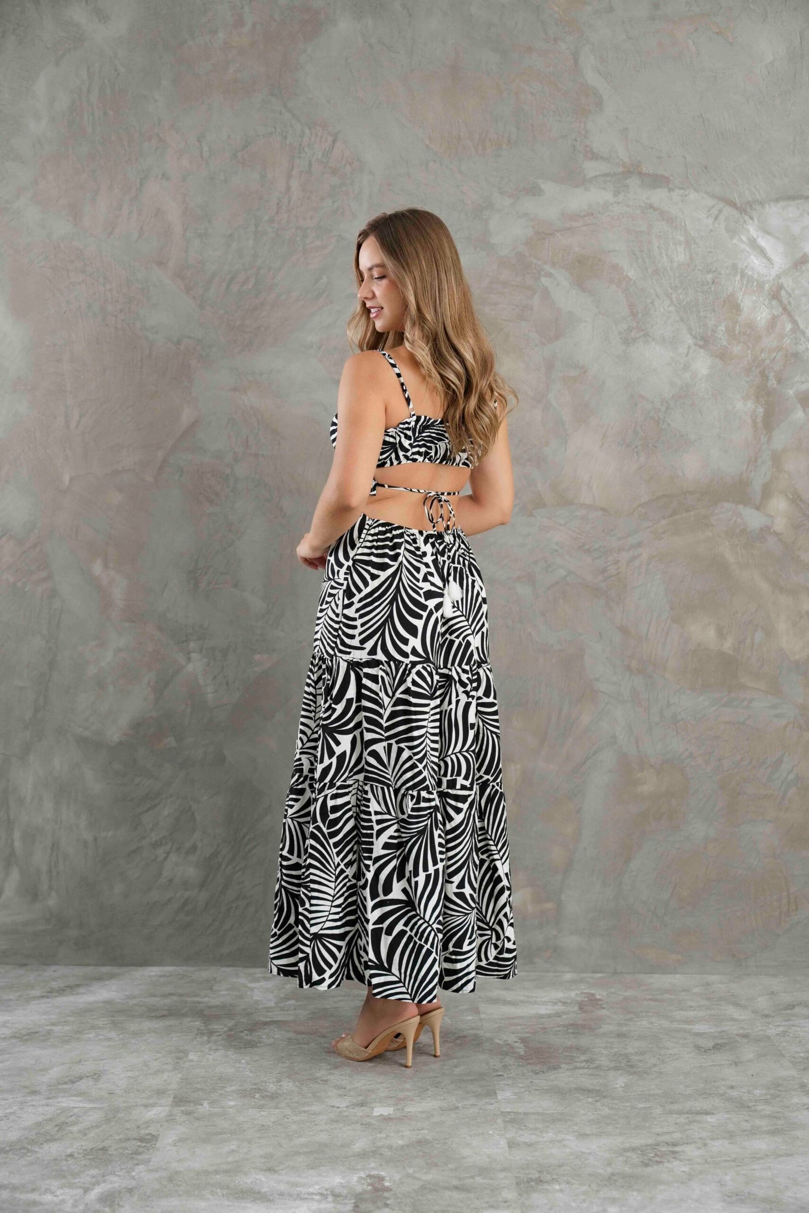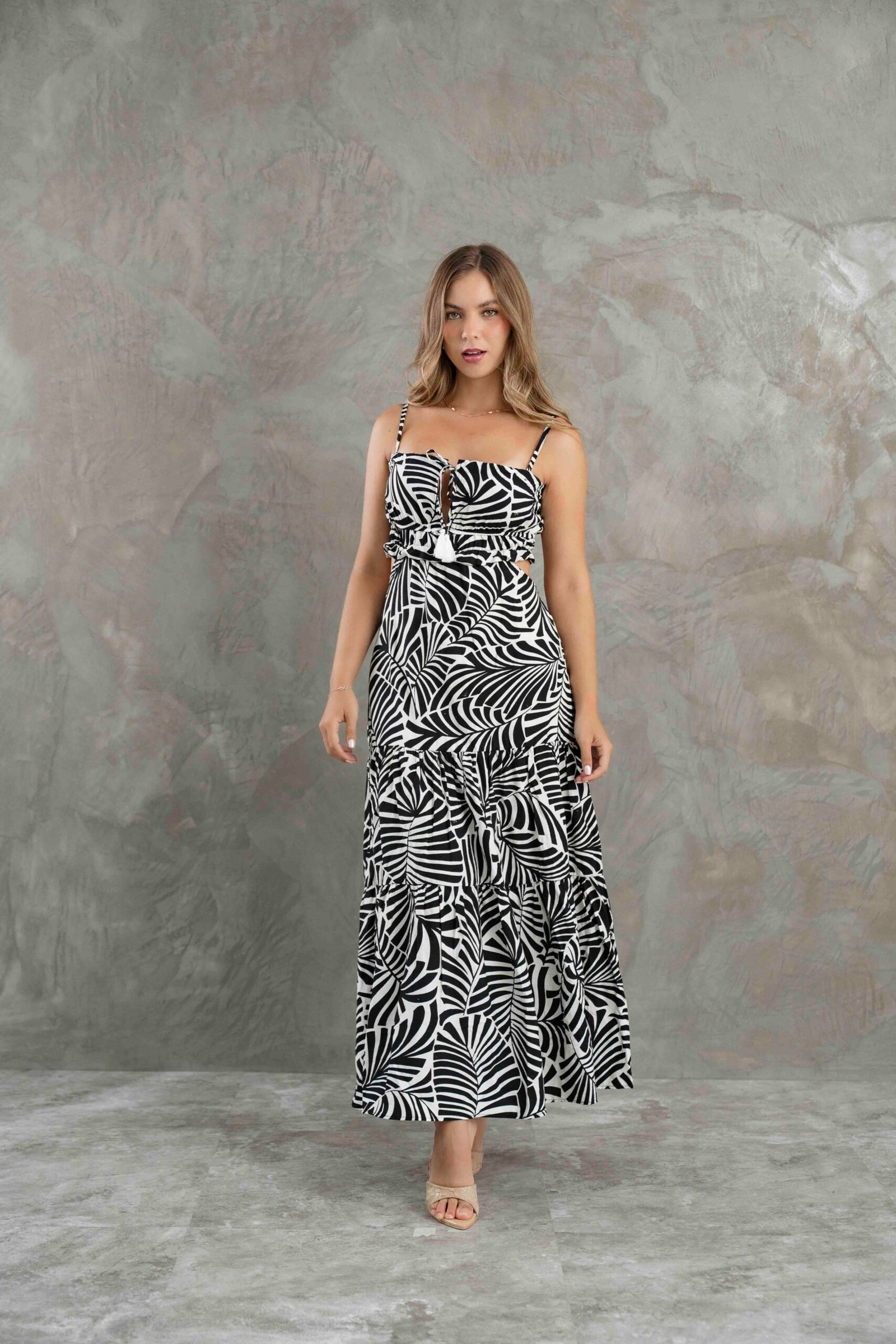 Vestido largo en tela bali, ligero y fresco con caída fluida. Diseño femenino que estiliza la figura, ideal para un look elegante y veraniego. Los diseños presnta un chispeado en blanco ligero. Fit: RegularMaterial: Tela baliModelo: Usa talla S – Estatura 1.66